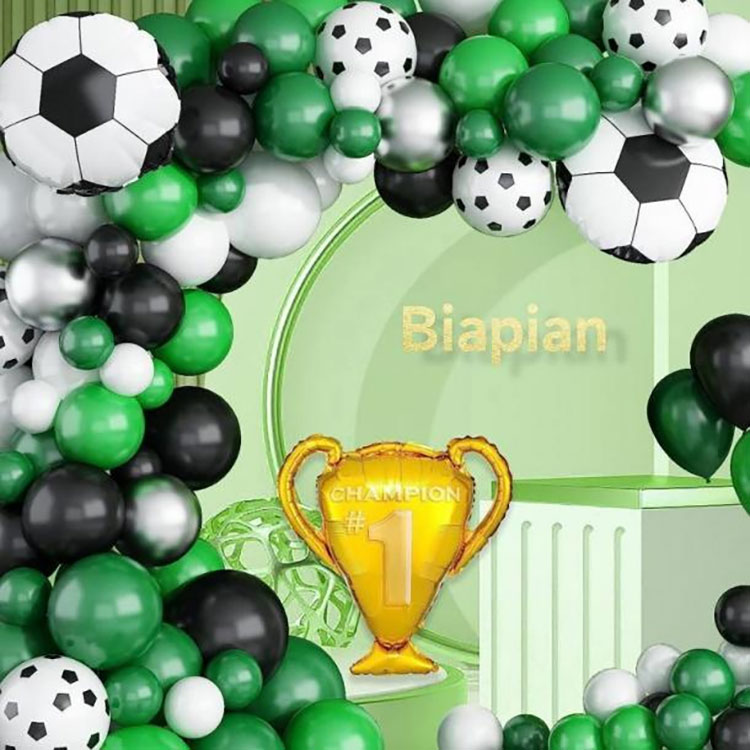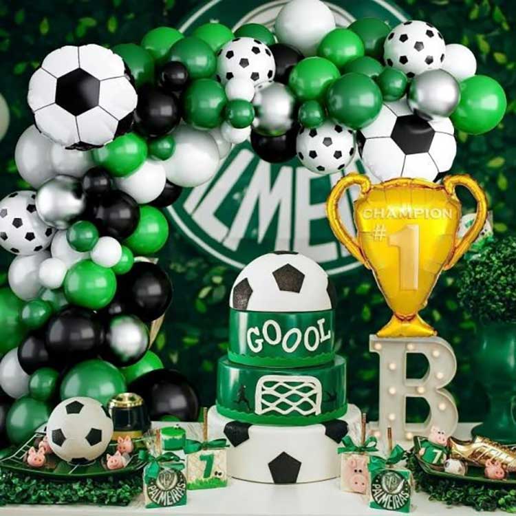 O kit de arco de balão com tema de futebol apresenta balões verdes, pretos e brancos como componentes principais, com balões em forma de bola de futebol adicionados como enfeites para criar um fundo decorativo com tema distinto. Este produto foi especialmente projetado para eventos de futebol, festas temáticas de futebol, atividades de clubes de futebol, etc., criando uma atmosfera animada e inspirando mais pessoas a amar as atividades de futebol.