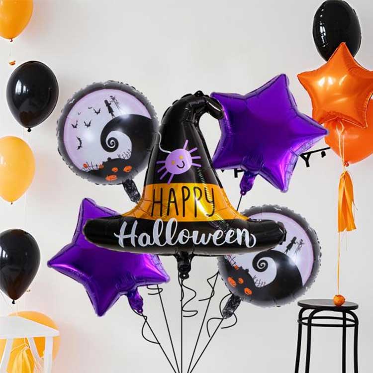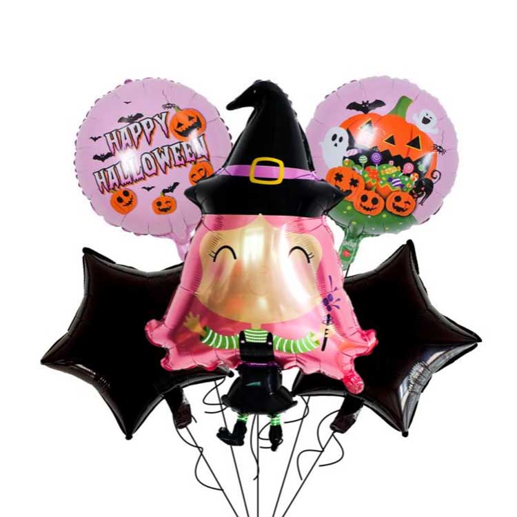 Um conjunto de cinco peças de Halloween é um conjunto de balões projetado especificamente para o Halloween. Normalmente consiste em balões de alumínio, balões de látex e outros acessórios. Inclui cinco tipos de balões no total! Cada conjunto apresenta um padrão ou personagem que combina perfeitamente com o tema do Halloween. Perfeito para decorações de Halloween, você pode até encher os balões com hélio para fazê-los flutuar! Isso realmente intensifica a atmosfera misteriosa do Halloween!