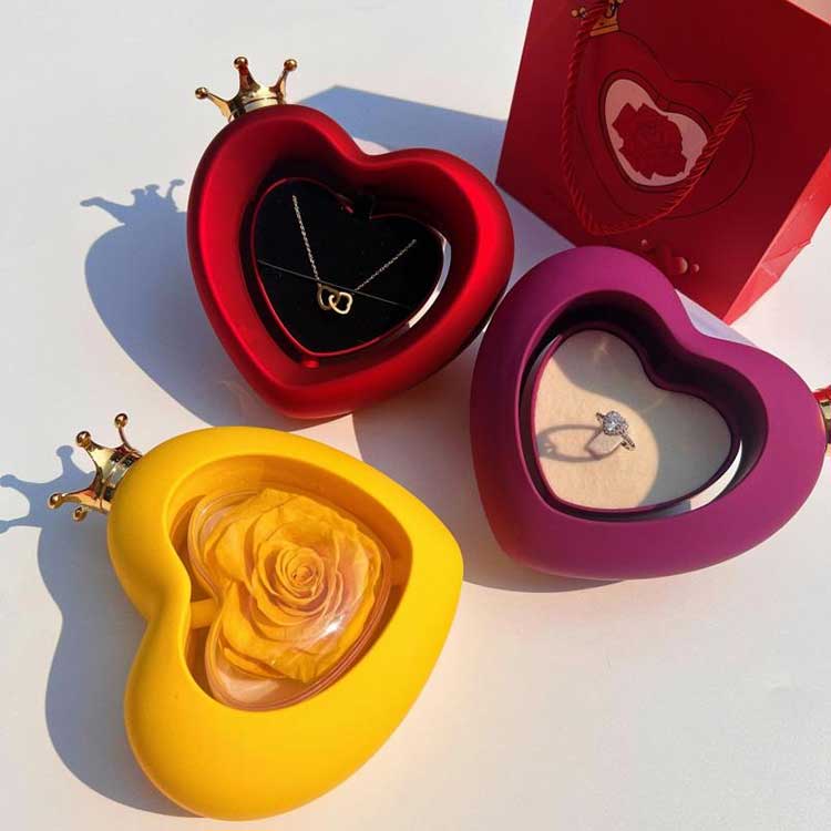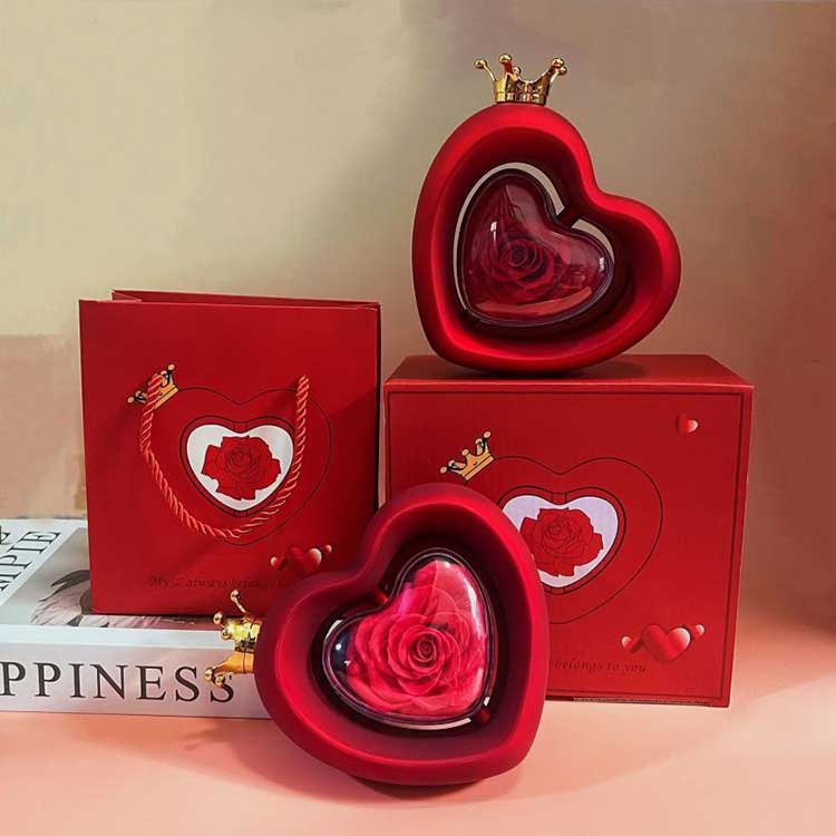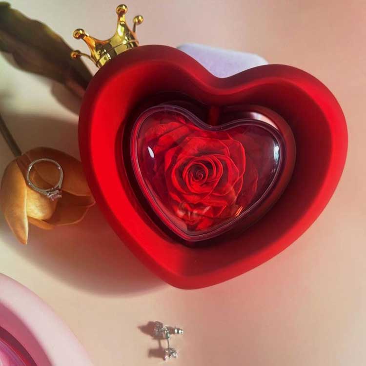 A caixa de joias rosa em formato de coração usa flores preservadas grau A, cuja cor e textura são indistinguíveis das flores frescas.