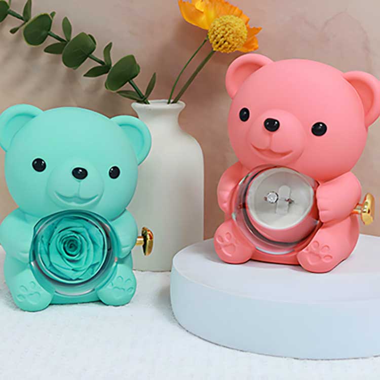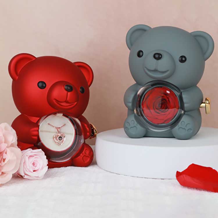 Esta caixa de joias Hug Bear Rose é usada para exibição em uma mesa, estante ou mesa de cabeceira. Sua característica mais marcante é a rosa preservada no centro. A abertura da rosa revela um compartimento para guardar joias, anéis ou lembranças.